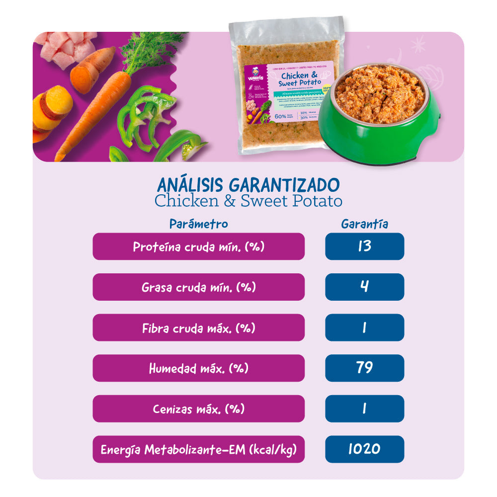 Sorprende a tu Wawi con esta exquisita mezcla de pollo y camote, una receta 100% natural, balanceada y aprobada por veterinarios. Chicken & Sweet Potato es ideal para ofrecerle a tu perri-hijo una comida llena de sabor, nutrientes y amor.
